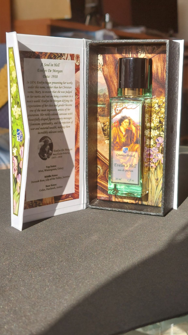 En 1874, Evelyn comenzó a presentar sus obras bajo este nombre, en lugar de su nombre de pila, Mary, para asegurarse de que fuera juzgada por sus méritos y no por ser una mujer en un mundo de hombres. Evelyn De Morgan, desafiando las expectativas de su clase y género, se convirtió en una de las artistas más impresionantes de su generación. Sus lienzos de colores intensos con figuras bellamente drapeadas transmiten mensajes de feminismo, espiritualidad y rechazo a la guerra y la riqueza material, lo que los hace increíblemente relevantes hoy en día. Su obra 'A soul in hell' es un claro ejemplo de ello y hemos reflejado esta asonancia en el propio nombre del perfume.